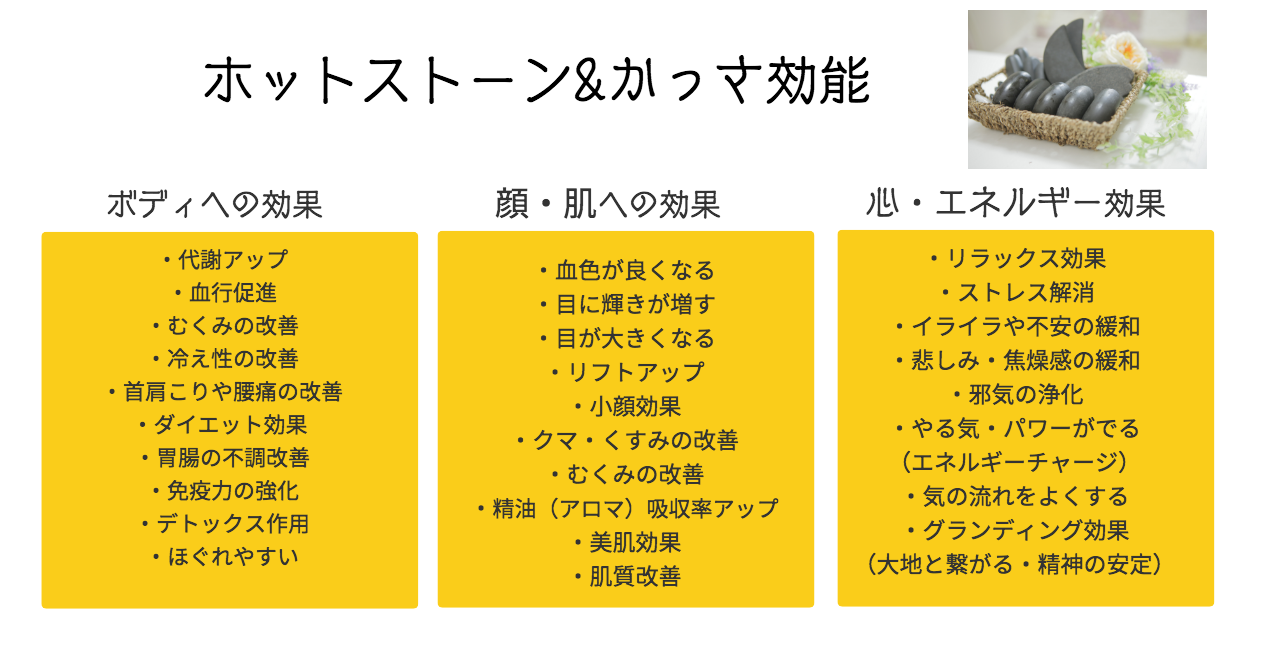 ホットストーンは、身体を温めて冷えやすい女性の身体の免疫力を高める事がで切るのに対し、かっさは、日頃から溜め込んでいる排出をお手伝いして、自然治癒力を高めます。