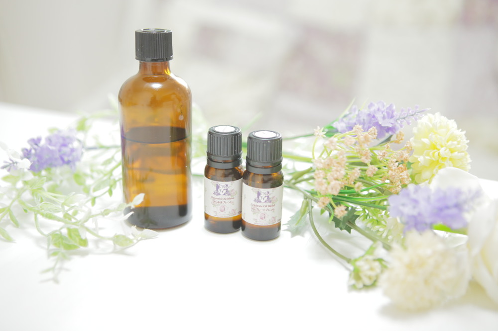 種のアロマブレンドから選んでいただき、マカデミアナッツオイルに精油を入れ、オリジナルの100%天然アロママッサージオイルを作ります。