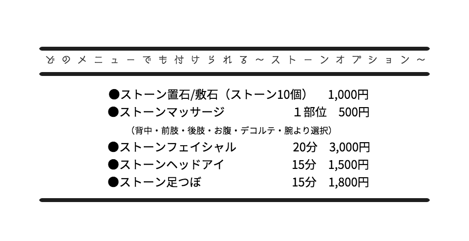 アロマの効能とストーンのエネルギーを融合で心も体も軽くなり、他にない心地よさをどうぞご体験ください。