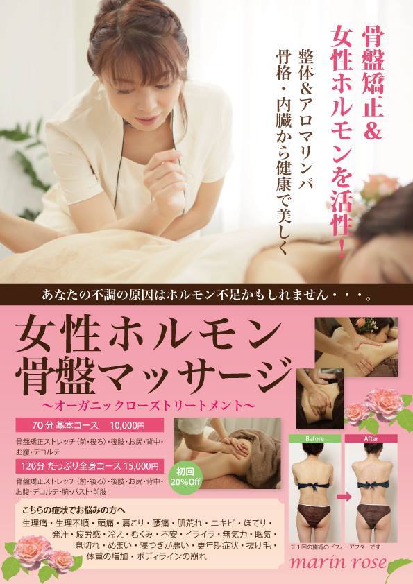 女性ホルモン骨盤マッサージでは、骨盤矯正ストレッチ、ローズ精油、マッサージ手法など様々な分野からアプローチして、女性ホルモンの活性を図り、女性のお悩みを解決します。